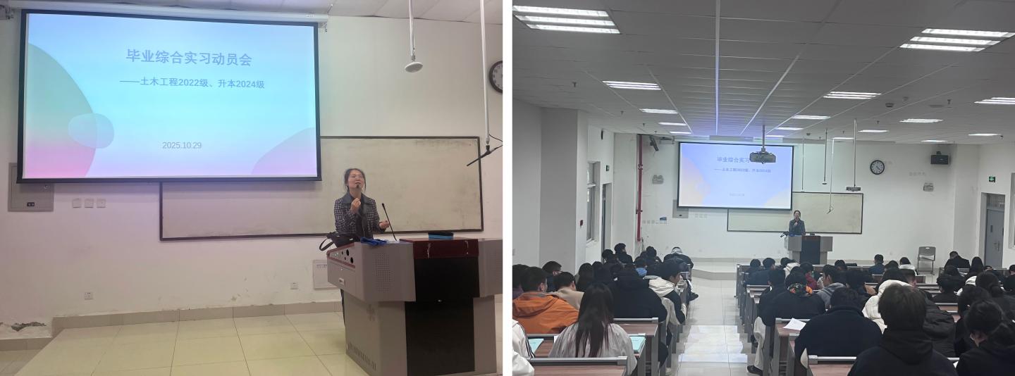 2025年10月29日下午4时,土木工程专业在多媒体20教室召开毕业综合实习动员大会,会议由系主任曹琛老师主持,土木工程系6名毕业综合实习指导教师及全体2026届土木工程专业学生参会。